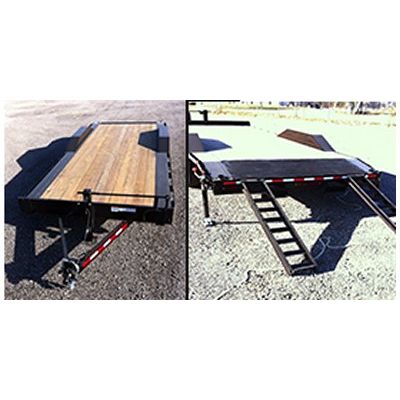 As shown: 8X20 Extra wide flatbed trailer. Fully adjustable Rear pull out ramps, steel dovetail with `Steel-Grip`surface and rear support jacks.