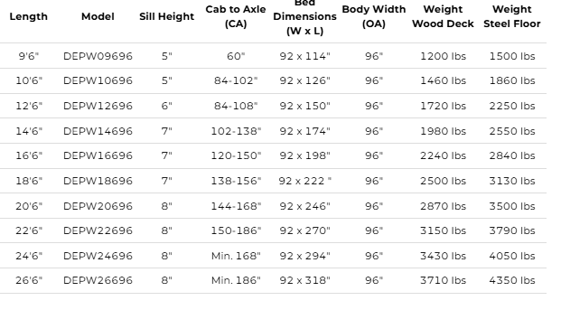 3" x 4.1# Channel cross members, 12" O.C. up to 18`. 5" x 3" Structural angle side longitudinal up to 18`. 4" x 5.4# Channel cross members, 12" O.C. 20` & up. 6" x 8.2# Structural Channel side longitudinal 20` & up. External stake pockets and rub rails. Structural Channel Chassis sills ( 34" ). 3/16" formed front & rear aprons. PT Pine lumber deck. All lighting is LED rubber mounted and NTEA and Federal compliant. Our products come acid etched, phosphate washed, with corrosion resistant epoxy primer and then baked for a strong superior finish.