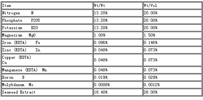 Fluid 20-20-20+TE. Appearance: Suspension. pH (10% Solution): 4.0 - 5.0. Specific Gravity 1.50-1.55® 18°C. Solubility: 100% soluble in water. Package: lkg/5kg /200KG drum