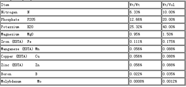 Fluid 10-20-40+TE. Appearance: Suspension. pH (10% Solution): 4.0 - 5.0. Specific Gravity 1.55 - 1.60 @ 18°C. Solubility: 100% soluble in water. Package: lkg/5kg /200KG drum.
