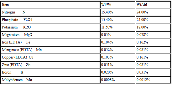 Fluid 24-24-18+TE. Appearance: Suspension. pH (10% Solution): 5.5 - 6.5. Specific Gravity 1.53 -1.58 @ 18°C. Solubility: 100%soluble in water. Package: lkg/5kg /200KG drum.