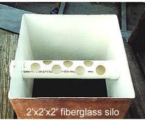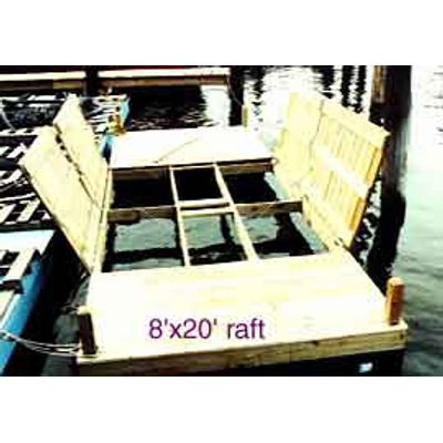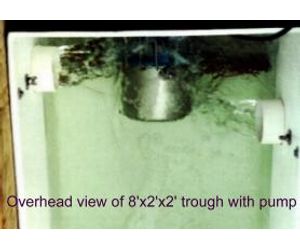 Upweller consists of an 2.44m x 6.1m, (8` x 20`) raft made of pressure-treated lumber, and a fiberglass trough with dimensions of 61cm x 2.44m, (2` x 2` x 8`). Inside the trough is a ½ horsepower, 110 volt, 5 amp pump, which is capable of circulating 800gpm (100gpm per silo). There are also eight 61cm x 61cm x 61cm, (2` x 2` x 2`) fiberglass silos with stainless steel hardware and 2 sizes of interchangeable screens (not included, 1.5mm and 2mm available). The upweller`s flotation consists of eight 2` x 1` x 4` foam-filled polyethylene floats.