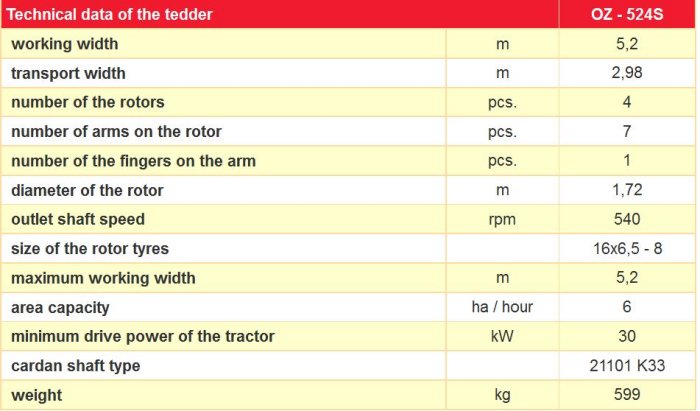 The fodder tedder OZ-524S is a four rotor tedder with working width 5,2 m.Their arms are hydraulically lifted to the vertical transport position and the amortization bars ensure their stability.