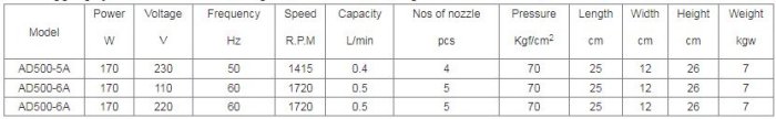 AD500 Specialty: Pumping system equipped with timer,feed water filter,intake solenoid valve,exhaust solenoid valve and 1M outer pressure tube. No drippings from nozzles while the operation comes to a stop.