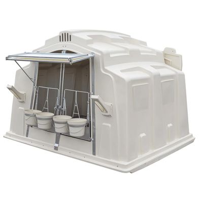For newborn calves up to 14 weeks old. The most efficient, versatile calf rearing solution. This modified Group Hutch works perfectly for paired newborn calves. By pairing calves together, stress is reduced and improves their overall health and development. Shown with 2 bottles and bottle holders (not included).