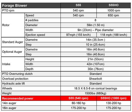The reducer gearbox on the S55HO lowers the input speed from 1000 rpm at the PTO to 654rpm at the rotor. With an ejection/blower speed of 118mph (189 km/h) and an 8 paddle rotor, it is the blower displacing the largest volume per hour on the market. The gearbox reducer offset can be positioned up or down for best alignment with all tractor models.