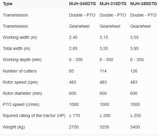 The MJH type is a machine of width 1.2 m to 2.8 m. This machine was designed for high power tractors and for work at a depth of 35 cm. It is equipped with a dual transmission with cascade pinion gearing and a unique design overload limiter.