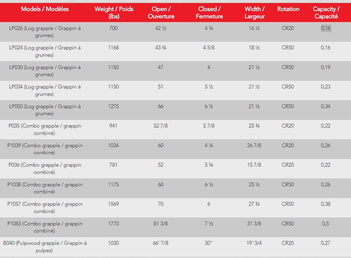 Models: LP026 (Log grapple). Weight (lbs): 700. Open: 42 ½. Closed: 4 ¾. Width: 16 ½. Rotation: CR20. Capacity: 0,16.