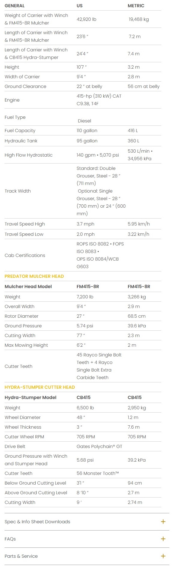 Rayco’s powerful new T415 forestry machine allows customers to change between a Predator forestry mower/mulcher head and a Hydra-Stumper stump cutter attachment for the ultimate in high production versatility. For mowing/mulching applications, the Predator mulcher head has a 7'7"” (2.3 m) cutting width and is powered by a pair of variable displacement drive motors. The Hydra-Stumper head muscles through stumps with its 48” (1.2 m) diameter x 3” (7.6 cm) thick cutter wheel equipped with 56 Monster Tooth™ cutter tools. Powered by a 415-hp (310-kW) CAT C9.3B Diesel Tier 4 Final engine, the T415 boasts a closed-loop Hydrostatic system to power the mulcher or stump cutter heads, sending 140 gallons per minute (530L/min) to the attachment drive motor(s). The hydraulic output is power-optimized to match the engine’s power curve, keeping the mulcher/stumper RPM constant even under load for a finer mulched product with fewer passes.