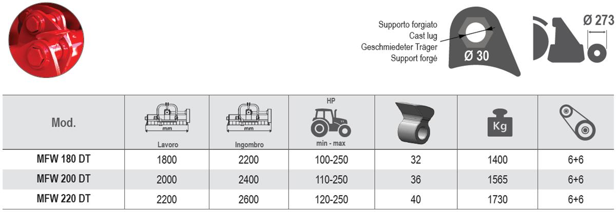 3 points ISO universal hitch with 2nd category fork. High resistance steel Hardox® reinforced double frame. Skids with lower plate. Double counter-knife. Opening rear door with hydraulic adjustment and built-in rear roller. Front protection chains (4 lines). Cardan shaft with disk clutch (tractor side fork 1” 3/8 Z6). EC guard kit. Gearbox with free wheel 1000’, 1 pto, mod. Vigolo C810. Double transmission.