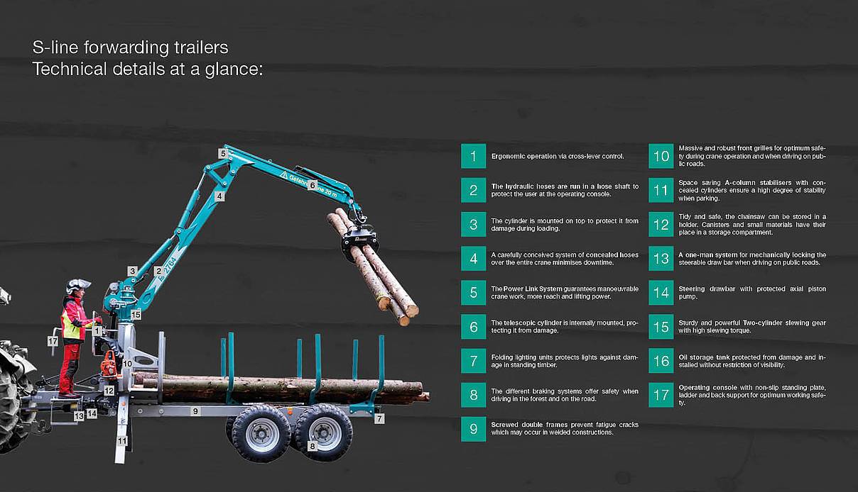 The Pfanzelt S-line forwarding trailers are especially designed for use by private forest owners and semi-professional operations. The reliability of the technology has the same priority as for professional. However, the job description is different. The Pfanzelt S-line forwarding trailer is especially designed for service with private wood owners and semiprofessional operations. An important criterion when buying a forwarding trailer is the safety equipment. Pfanzelt forwarding trailers offer all safety features required by KWF, FPA and the trade association.