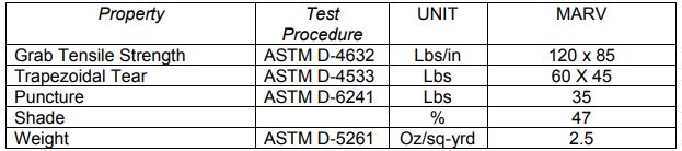 Style : 47% Shade. Typical Uses : Agricultural Shade. Key Attributes : 6` to 17` widths High UV Stability. NTPEP Listed : No.