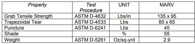 Style : 55% Shade. Typical Uses : Agricultural Shade. Key Attributes : 6` to 17` widths High UV Stability. NTPEP Listed : No.
