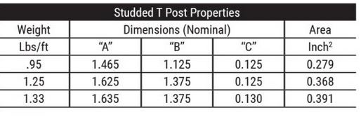 Studded “T” Posts: The weight of each post is 0.95, 1.25, or 1.33 lbs/ft. Studs are spaced uniformly along the length of the “T” shaped post.