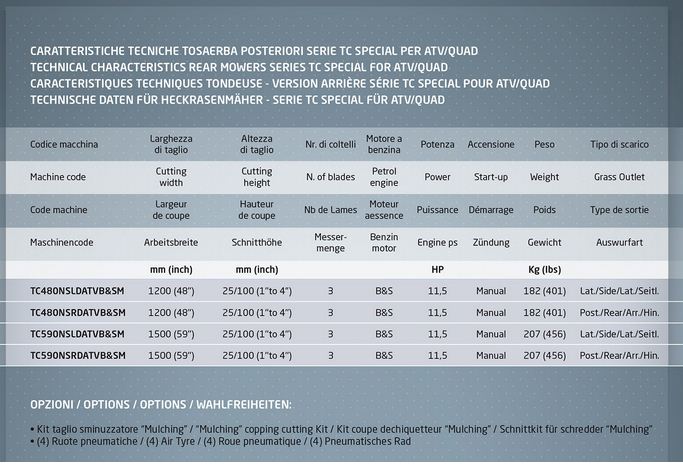 Agile, robust and safe on any kind of ground, the TC Special series of Caroni Mowers are the ideal partners of ATV/QUAD models. Designed and realized according to the most recent construction technologies and systems, both in front and rear version, they can guarantee a clean and precise cut, 25 to 100mm (1” to 4” inch) on the whole working width of 1200 or 1500 mm (48” or 59” inch). Other versions can also be realized: with a 1800 mm (71” inch) working width and rear or side unloading, or with a 2400 mm (95” inch) working width with rear unloading.