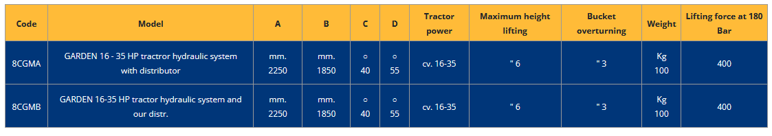 The Garden Series front loader, designed for tractors with power ranging from 16 to 35 hp, is ideal for light agricultural work and gardening. Compact and maneuverable, this tool is perfect for small- to medium-sized plots, allowing loading and lifting operations with ease.