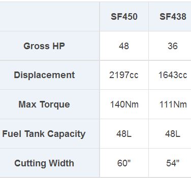 60-inch mower deck is available for SF450 and 54-inch mower deck is available for SF438 with grass collectors.