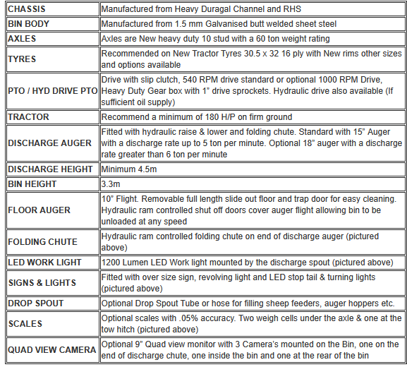 Illustrated 25 Ton 30 M³ Chaser Bin with Roll Tarp and Hydraulic Folding Chute standard on all 25 Ton Chaser Bins Now 28 Ton 33 M³. The unit is standard with a 15" discharge auger, with a capacity of up to 5 tonne per minute with an optional 18" discharge auger available. The standard drive is setup for a 540 rev drive tractor with an option of 1000 rev drive or hydraulic drive if sufficient oil supply. The cleaning of this unit is simple, just pull the floor bar out from the back and the bin will clean out completely.