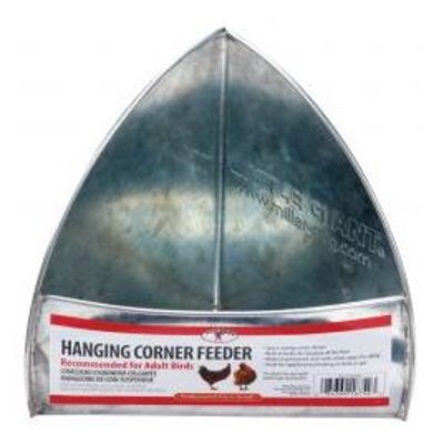 Works great for supplemental uses like feeding shells or grit. Space-saving corner design with built-in hooks for hanging in hutch or coop. Sturdy galvanized steel has rolled edges for safety.