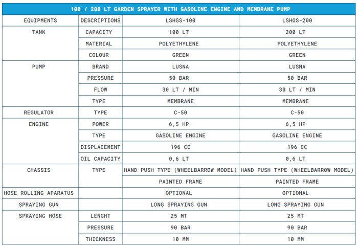 Lusna - Model 100-200 LT -Garden Sprayer with Gasoline Engine with Membrane Pump