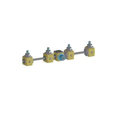 This mechanical/hydraulic gearbox set is configured in a transmission system that aligns 1 gearbox and several angular boxes. The configuration is generally applied to manure spreaders with a number of vertical or horizontal disc rotors corresponding to the number of gearboxes.