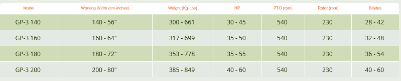 The Model GP-3 tiller is a fixed rotary tiller that is well suited for tractors up to 60 hp. The new 3-point-hitch square design gives this implement a very sturdy and solid attractivness. The first tiller model to be chain-driven, the machine comes with a single-speed (GP-3) or 4-speeds (GPC-3) gearbox, 4 or 6 blades per flange (C-shaped or L-shaped), automatic linkages and adjustable working height through skids. Waterproof rotor available on demand.