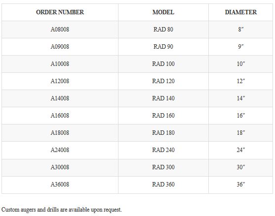 Available in 48″ length for hydraulic drives and 36″ for the TM-48, 8″ to 36″ diameters, carbide bullet style teeth, 3/8″ thick double flighting.