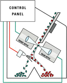 The sorting process of our CRYSTAL sorters is extremely simple: Through a vibrating feeder the product to sort is conveyed to the optical section where each single particle is scanned many times. The sensors convert the image into digital information. The relevant digital information is then compared to the data stored in the memory. Once the characteristics of the single analyzed element have been identified, a high precision ejector, shunts the non-conforming piece off to a reject hopper, whereas the "good" element is allowed to continue to the good product hopper.