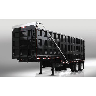 The hydraulic lift cylinder allows and restricts the trailer dumping angle up to 45°, which is optimal for ejecting debris and maintaining a safe operating height. The drop deck allows for more volume and reduces overall height, also the trailer is safer than other trailers due to the lower center of gravity. Automatic Tarp system provided in cab controls makes operation fast and efficient in the field.
