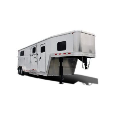 Kiefer® straight load trailers feature a smooth aluminum exterior. The Kiefer no-leak roof design channels water away from the trailer interior using special aluminum extrusions. Kiefer manufactured doors provide double sealing around the perimeter to lock out the elements. Kiefer floors are I-beam cross-member reinforced, extruded plank design. Models equipped with dressing rooms include camper door and screen door, saddle racks, bridle hooks, brush box, and spare tire carrier. Side ramp entrance allows access to front box stall. Horse area can be converted from 2-horse straight load to box stall or open area. Rear ramp/side ramp loading are included in many packages. Stalls are 40` wide and 84` long from center of breast bar to center of butt bar, with 48` in front of Breast Bar to provide more room for large horses.