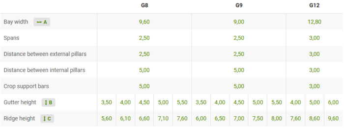 Structures designed for obtaining a large volume of air inside the greenhouse. The gothic form of the structure and the arch curvature make better use of solar radiation and also reduces the risk of dropping onto the crop, due to a better drainage of the condensation into the gutters.