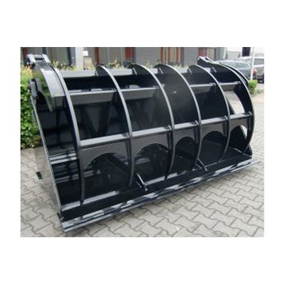 The AP grab buckets, type PGX / TGX are heavy, robust machines with a large capacity, suitable for use to a heavy telescopic handler or wheel loader. The stiffening profile in the bucket gives the machine extra strength to allow the PGX / TGX to accomplish the toughest tasks. The increased back profile avoids spilling of feed. Thanks to the ingenious geometry the upper frame (when opened) will not extend the bucket. This makes it possible to move the bucket to a wall and shovel all the material, so no rests will be left behind and the upper frame will not touch the wall. The PGX / TGX is provided with heavy pivot points and can be equipped with all common quick attachments (welded). The types PGX come with fixed tines (thickness 25 mm) and an extra heavy frame with 3 pivot points. The types TGX are equipped with removable Kverneland tines and an extra heavy top frame with 2 pivot points. Widths from 260 to 300 cm, the capacity varies from 2,25 to 2,70 m³.
