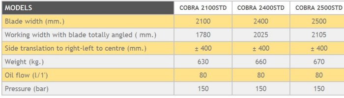 Grader with hydraulic blade translation included, ± 35° rotation, ± 27° right/left inclination and fitting plate kit. It is possible to equip the grader with on/off or proportional control valve both with electro valve. The controls can be choosed among: joystick, 14 pins connector, manipulator with 3 levers or radiocontrol.