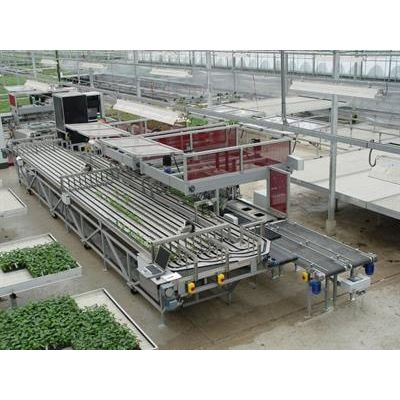 After the plants are graded, they are distributed into various grades. These grades are determined using the set sorting criteria. With the use of a plant transfer unit, the plants for each grade are replanted into a tray. It is also possible to replant the plants in a staggered pattern.
