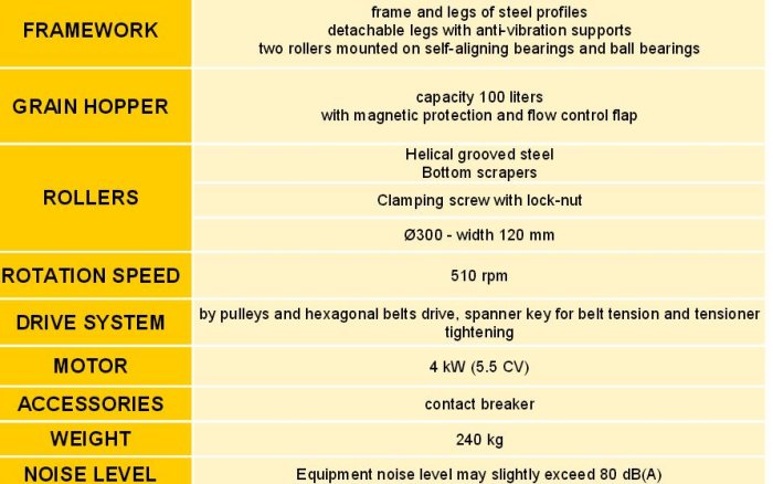 Crushes straw cereal: barley, oat, wheat, triticale....The synchronous drive system, combined with mechanical clamping from springless oilers, flattens grains instantly, without any adjustment and in a perfect homogeneity with minimum residual flour.