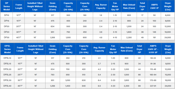 Grain Dryer: Low Profile Design – 16’ + Legs. Single and Three Phase Models Available. Capacities Up To 1,400 BPH. Energy Efficient. Vacuum Cooled Design. Very Clean & Quiet. StayKleen Designed System in Plenum and Cooling Sections. Large Plenum Access Door. Standard Service Platform.