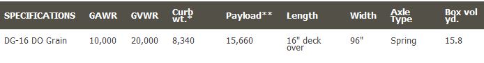 96″x16′ box. 40″ tall sides. Name brand radial tires. Two 10,000 lbs. Dexter axles. Truck-lite® rubber mounted sealed beam lights. Rear gate opens as “barn doors,” “spreader gate” and “sliding grain doors”. 8″ I-beam main frame, 21#/ft. 3/16″ floor. 11-guage sides. Scissor hoist