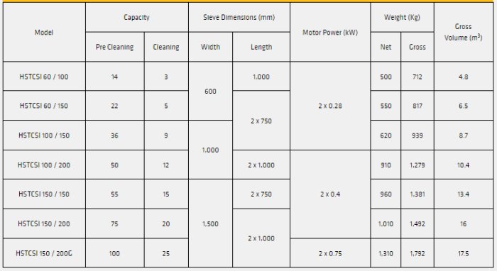 The Grain Separator (HSTCSI) is a multipurpose cleaning machine engineered to efficiently eliminate impurities from various types of grains and cereals during the cleaning process. Featuring dual adjustable sieve decks, the machine ensures thorough cleaning through vibration coupled with external aspiration. It is versatile enough to serve as a Silo Intake Separator during pre-cleaning processes, or as a specialized separator during internal cleaning. The unit can be equipped with either an aspirator or a hopper at the stock outlet. Key features include quick and easy screen replacement, flexible and adjustable inclination, minimal maintenance requirements, custom sieve perforation design, high capacity and efficiency, durability, long lifetime, and low energy consumption. Capacities are based on wheat with a specific gravity of 0.78-0.80 kg/dm³ and may vary depending on the product's variety, initial condition, and contamination.Most popular related searches