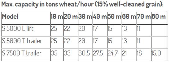 Capacity: 10-35 tons/hour . Type S 5000: 3-step blower - as trailer- or lift model. PTO rpm 540. Tractor size min. 50 kW . Type S 7500: 4-step blower - as trailer model with standard aircleaner system. PTO rpm 1000. Tractor size min. 70 kW. Available with or without loading equipment.