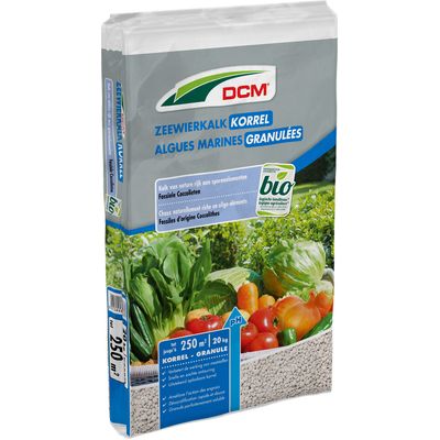 DCM`s Granulated Fossilized Seaweed Lime, derived from coccolites, is a mild-action, fast-dissolving lime ideal for various horticultural applications. It is effectively used in vegetable gardens, ornamental gardens, orchards, and ponds. The product is composed primarily of granulated lime with a calcium carbonate (NV 50) content. The recommended dose for optimal results is 8 to 12 kg per 100 square meters. Granulated fossilized seaweed lime enhances soil quality and supports organic agriculture, particularly in the growth of organic asparagus. Suitable for those looking to improve soil condition and nutrient availability in a range of garden or agricultural contexts, it aligns with organic cultivation practices.