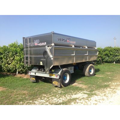 Rectangular tank made of flared AISI 304 stainless steel sheet, ideal for transporting grapes harvested by hand or by machine, liquids, semi-liquids or grains thanks to the two anti-wave bulkheads and the hermetic closure. Produced in various sizes, fully customisable and adaptable to any trailer. Unloading is carried out from the side watertight hydraulic tailgate, with internal auger and chute or with a lateral spout. The tank is supplied with a CE certificate and a user and maintenance manual in accordance with the 2006/42/EC Machinery Directive.