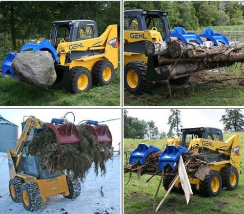 Handles it all: Gravel, Logs, Garbage, Large Bales, Manure, Brush, Cement - the list is endless. 2 Hydraulic Grabbers work independently to hold uneven loads. Hardened cutting edge. Turns your skid steer into a multi-purpose machine without changing bits. Available from 48` to 96`.