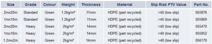 GrassProtecta® grass reinforcement mesh is supplied on 2m x 20m & 1m x 10m rolls in two thicknesses (11mm & 14mm) as determined by the application and manufactured from partly recycled UV Stabilised polyethylene polymer.