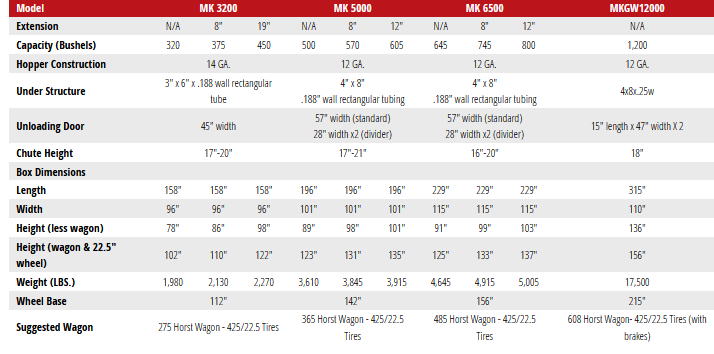 The MK Gravity Box comes in three models, available with optional extensions. Ranging from 270-745 bushel capacities, we have the perfect sized Gravity Box for your operation. Available on the proven running gear from Horst Wagons, or as a box-only model to place on your own wagon, you can rest easy knowing that the MK Martin Gravity Box is going to get your load where it needs to go.