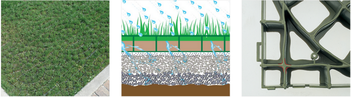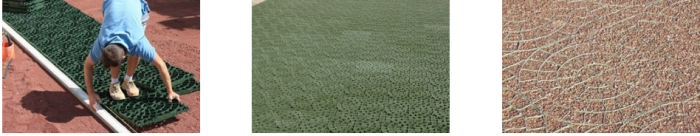 The grating is made of a particular plastic material with high quality technical/mechanical characteristics, non-toxic and unattackable by atmospheric and chemical agents. The Pratopratico® flooring develops rapidly and economically through the union of various gratings with a male/female hooking system. The aesthetic, functional and ecological advantages offered by this innovative flooring are evident: a lawn surface naturally filters the soil’s meteoric waters, respecting the site’s hydrogeological balance. During the summer period, moreover, it does not produce undesired thermic effects linked to overheating of the surface with natural finishing.