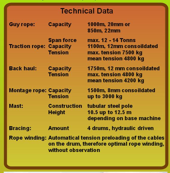 The toweryarder Grizzly 1000 can be used as 2 rope device with 1000m rage for uphill use and for 550m horizontal or downhill use. Due to the big traction force of the winch, the use of this machine is very economical. 3- or 4-axis lorrys with all-wheel drive may be used as basic vehicle for the Grizzly 1000. Optionally the drive of the yarder can be made with an additional engine or with the lorry`s Diesel.