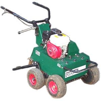 The shock absorbing aeration mechanism is driven with a large diameter crank and sealed for life bearings which means many years of trouble-free service with the minimum of maintenance. The front ground drive wheel are fixed in gear and the rear wheels are free for turning and maneouvring the machine, raising and lowering in and out of work is tread bar assisted. The operator handles are mounted to the chassis using three point shock absorbing mountings for low operator handle vibration levels (HAV). Set-up and operator controls are simple making the 345MD easy to use for inexperienced operators. The overall width is 80cm (32") so it can access pedestrian gateways/ doorways etc.