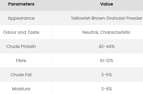 The powder texture is in form of coarse powder of approx. 40 mesh size and is an excellent cattle feed having protein content (exceeding 35%) which significantly enhances the nutritional value of the feed.