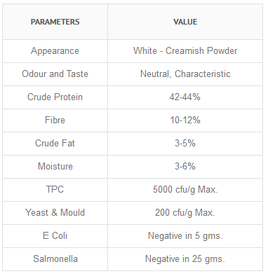 The powder texture is in form of coarse powder of approx. 40 mesh size and is an excellent cattle feed having protein content (exceeding 35%) which significantly enhances the nutritional value of the feed.
