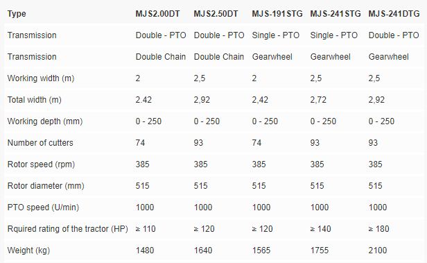 The MJS type is a machine with a working width of 1 m to 2.5 m equipped with a triplex chain transmission (model MJS-DT) or a cascade pinion transmission (MJS-TG). This characteristic makes the machine ideal for medium to high power tractors.